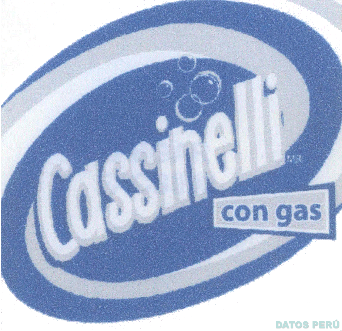La etiqueta conteniendo la denominación CASSINELLI escrita en letras características y la frase CON GAS escrita en letras características dentro de la representación estilizada de trazos irregulares circulares, con la representación de burbujas, todo en los colores azul, plomo y blanco; conforme al modelo adjunto