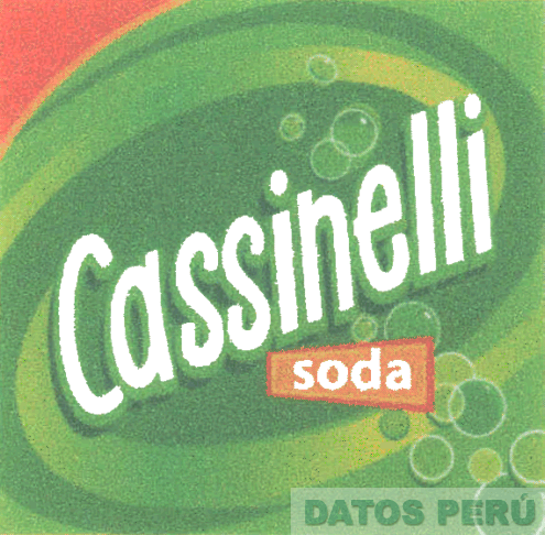 La etiqueta conteniendo la denominación CASSINELLI escrita en letras características y la palabra SODA escrita en letras características dentro de un recuadro, la representación estilizada de trazos irregulares con la representación de burbujas, en los colores verde, anaranjado y blanco; conforme al modelo adjunto