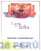 El logotipo rectangular que contiene la denominación CASTA DEL INKA escrita en letras características, sobre la cual se aprecia la representación estilizada de una máscara preincaica, la cual proyecta una sombra; en la parte inferior aparece la denominación ELABORADO y EMBOTELLADO POR MONCAL SAC, y una figura característica; asimismo se aprecian unas uvas; todo en la combinación de colores gris, verde, blanco, anaranjado, marrón, amarillo y granate; conforme al modelo adjunto.