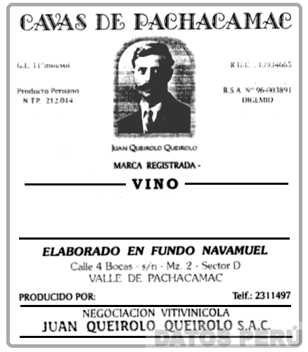 LA ETIQUETA CON LA DENOMINACION CAVAS DE PACHACAMAC ESCRITA EN LETRAS CARACTERISTICAS; DEBAJO LA FIGURA DE UN PERSONAJE DENTRO DE UN RECUADRO CON EL NOMBRE JUAN QUEIROLO QUEIROLO Y FRASES ALUSIVAS AL PRODUCTO; CONFORME AL MODELO ADJUNTO