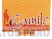El logotipo conformado por la denominación CCAMILE HOTEL escrita en letras características de color granate con borde blanco con la figura estilizada de un hombre subiendo rocas asimétricamente distribuidas, sin reivindicar los colores anaranjado oscuro ni amarillo oscuro, conforme al modelo adjunto