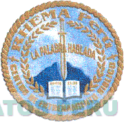El logotipo circular conformado por la denominación CENTRO DE ENTRENAMIENTO BIBLICO RHEMA PERÚ y la frase LA PALABRA HABLADA, ambas escritas en letras características y la representación estilizada de una espada y un libro conteniendo la frase MARCOS 11