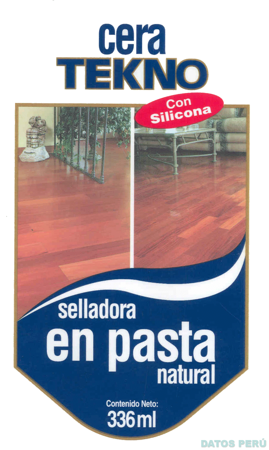 La etiqueta rectangular de orientación vertical en cuya parte superior central se aprecia la denominación CERA TEKNO escrita en letras características, en la parte central se aprecia una figura a manera de escudo dividido en tres campos, en los dos campos superiores se aprecia la figura característica de dos ambientes de una casa, en el campo inferior se aprecia una línea oblicua y la frase SELLADORA EN PASTA NATURAL escrita en letras características, todo en los colores azul, blanco, rojo, dorado, marrón claro, verde, marrón oscuro, gris y beige; conforme al modelo adjunto