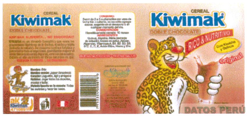 El logotipo de forma irregular conteniendo la denominación KIWIMAK escrita en letras características, la representación humanizada de un jaguar amazónico llevando a su mano izquierda un vaso con chocolate, al lado izquierdo la representación humanizada de un jaguar amazónico sobre un skate, figuras irregulares y frases alusivas al producto (sin reivindicar), en los colores marrón en diferentes tonalidades, azul, blanco, amarillo, rojo, negro y verde; conforme al modelo adjunto