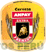 La etiqueta conformada por la denominación CERVECERIA GRUPO TORVISCO S.A. escrita en letras características, en el centro el diseño estilizado de un escudo con la figura representativa de un toro y la denominación CERVEZA ANPAY EXTRA PREMIUM (sin reivindicar las denominaciones CERVEZA y EXTRA PREMIUM) escrita en letras características, a ambos lados la forma estilizada de tres espigas de cebada y sobre el fondo diversas burbujas diseminadas, todo en los colores dorado, ámbar, rojo, amarillo, anaranjado y blanco; conforme al modelo adjunto