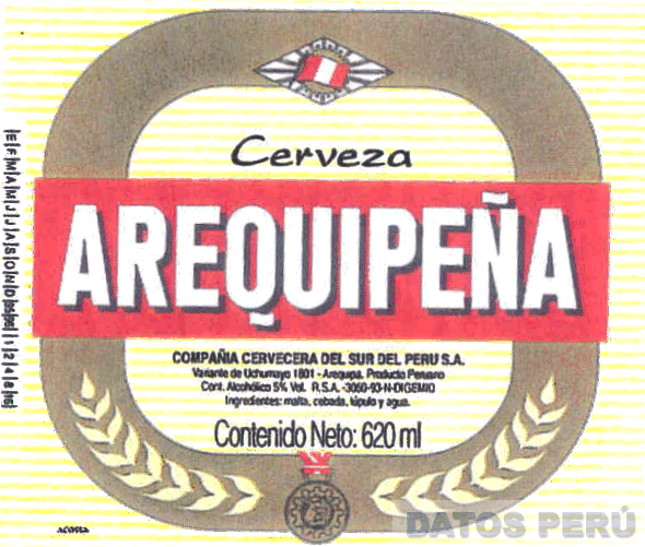 La etiqueta rectangular de fondo color blanco y en rayas horizontales color amarillo, conteniendo una banda color verde olivo formando un rectángulo con los bordes redondeados, sobre la cual en la parte superior se observa un rombo con la figura de una bandera sobre un sol radiante, debajo la palabra CERVEZA escrita en letras características de color negro; en el centro y sobre una banda horizontal color rojo se aprecia la palabra AREQUIPEÑA escrita en letras características de color blanco con sombra color negro; en la parte inferior se observa leyendas alusivas al producto en color negro y sobre la banda verde olivo se observa una medalla delineada en color negro con cinta roja y blanca y a sus costados espigas de cebada; conforme al modelo adjunto