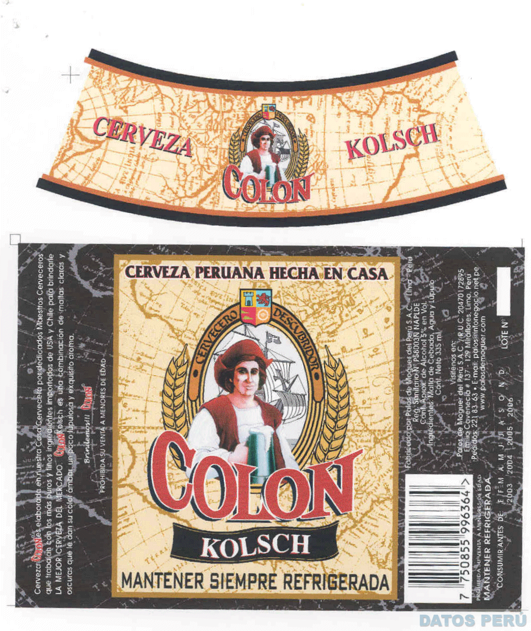 La denominación COLON escrita en letras características dentro de una figura rectangular, en la parte superior se observa una figura ovalada conteniendo la representación estilizada de una persona y una embarcación, a los lados se observan dos espigas estilizadas, en la parte inferior de la denominación se aprecia la palabra KOLSCH escrita en letras características dentro de una figura rectangular; sobre esto se observa una figura rectangular (semi curva) conteniendo la denominación COLON escrita en letras características, las palabras CERVEZA COLON KOLSCH escrita en letras características y una figura ovalada conteniendo la representación estilizada de una persona y una embarcación a cuyos lados se observan dos espigas estilizadas y demás frases alusivas al producto, en los colores rojo, dorado, amarillo, crema, verde, blanco y negro; conforme al modelo adjunto