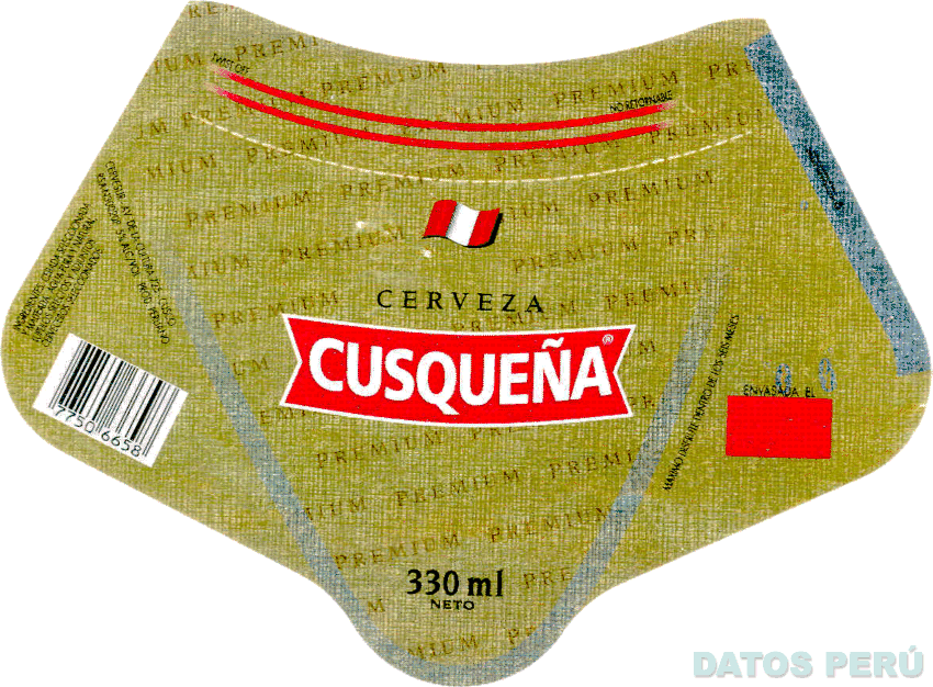 La etiqueta de forma envolvente que lleva en la parte superior la bandera peruana flameando y en la parte central la denominación CUSQUEÑA escrita en letras estilizadas dentro de una figura poligonal irregular, y la palabra CERVEZA sin reivindicar, en la combinación de colores dorado, rojo, blanco y negro; conforme al modelo adjunto