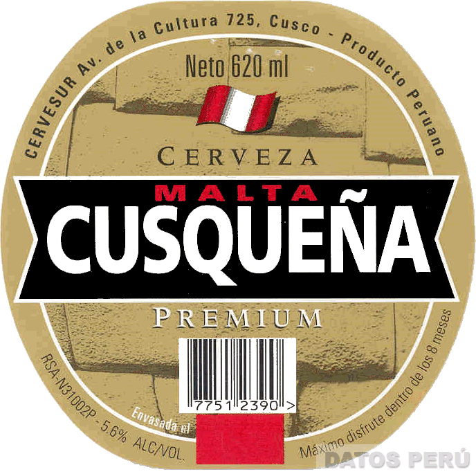 La etiqueta de forma ovalada con fondo de la piedra de los doce ángulos, apreciándose en la parte central la denominación MALTA CUSQUEÑA escrita en letras características, dentro de una figura geométrica irregular, en la parte superior central una bandera peruana flameando y en la parte superior e inferior respectivamente las palabras CERVEZA y PREMIUM, en la combinación de colores dorado, blanco, rojo y negro; conforme al modelo adjunto