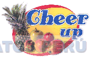 El logotipo conformado por una figura ovoide de fondo color amarillo y borde color rojo conteniendo la denominación CHEER UP escrita en letras características en color azul y borde color blanco y las figuras estilizadas de un mango, dos manzanas, una naranja, una piña y un durazno en los colores verde, marrón, anaranjado, rojo y amarillo; conforme al modelo adjunto
