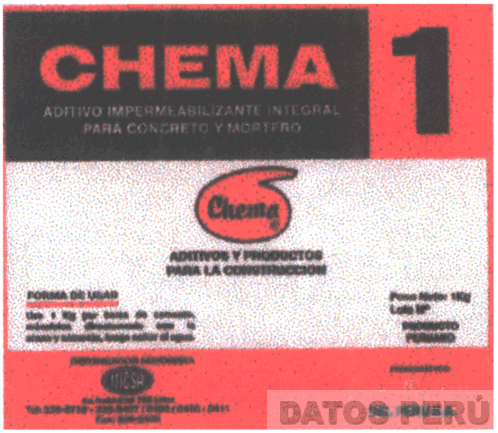 La etiqueta rectangular dividida en tres franjas horizontales en los colores negro, anaranjado y blanco; en la parte superior la denominación CHEMA en letras de color anaranjado sobre fondo rectangular de color negro, al costado derecho el numero 1 de color negro sobre un rectángulo mas pequeño de color anaranjado; en la franja blanca, en la parte superior central, la denominación CHEMA en letras características sobre fondo anaranjado; según modelo adjunto