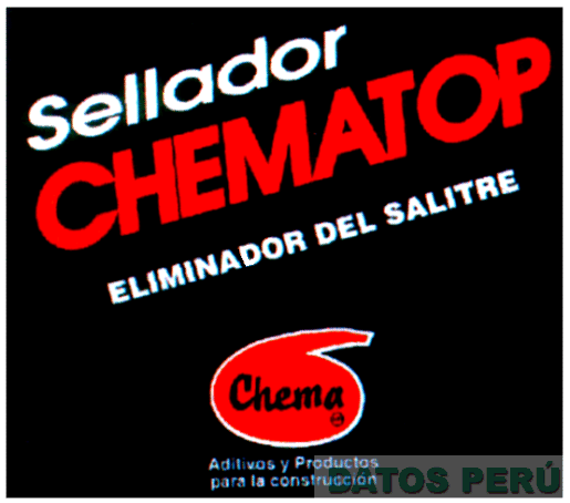 La etiqueta de color negro de forma cuadrangular en la que aparece la denominación CHEMATOP escrita en letras características en color rojo, sobre la que se encuentra la denominación SELLADOR en letras de color blanco sin reivindicar; debajo la denominación ELIMINADOR DEL SALITRE en letras blancas sin reivindicar; debajo la denominación CHEMA y diseño característico,
