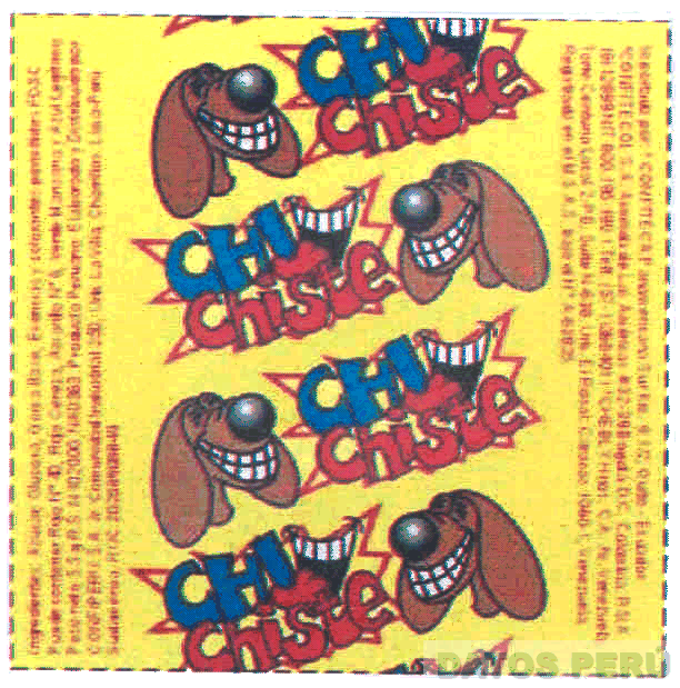 EL LOGOTIPO CONFORMADO POR LA FIGURA CUADRANGULAR SOBRE FONDO AMARILLO Y LA DENOMINACION CHI CHISTE ESCRITA EN LETRAS CARACTERISTICAS SOBRE LA FIGURA ESTILIZADA DE UNA ESTRELLA, LAS FIGURAS ESTILIZADAS DE UNA BOCA SONRIENTE Y EL ROSTRO DE UN PERRO SONRIENDO; TODO EN LOS COLORES AZUL, ROJO, BLANCO, NEGRO Y MARRON; CONFORME AL MODELO ADJUNTO