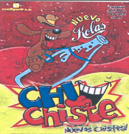EL LOGOTIPO CONFORMADO POR LA FIGURA CUADRANGULAR, EN LA PARTE SUPERIOR SOBRE FONDO ROJO LA FIGURA ESTILIZADA DE UN PERRO CON SOMBRERO DE COLOR MARRON SOBRE UNA BOTELLA CON BORDE CELESTE Y UNA CUERDA COLOR TURQUESA, EN EL EXTREMO SUPERIOR IZQUIERDO LA DENOMINACION CONFIPERU S.A. Y UNA FIGURA CUADRANGULAR EN LOS COLORES AMARILLO Y BLANCO. EN LA PARTE INFERIOR SOBRE FONDO AMARILLO LA DENOMINACION CHI CHISTE NUEVOS CHISTES! ESCRITA EN LETRAS CARACTERISTICAS Y LA FIGURA ESTILIZADA DE UNA BOCA SONRIENDO, EN LOS COLORES AZUL, ROJO, BLANCO Y NEGRO; CONFORME AL MODELO ADJUNTO