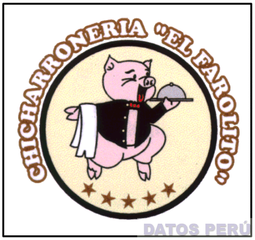 El logotipo conformado por la denominación CHICHARRONERIA EL FAROLITO escrita en letras características, de color marrón, alrededor de una figura circular de borde negro y fondo crema conteniendo la figura característica de un cerdo en color rosado, con lengua roja, vestimenta en color negro, corbata roja, un mantel blanco y una bandeja de color plomo; debajo cinco estrellas de color marrón, todo conforme al modelo adjunto