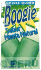 LA ETIQUETA DE FONDO VERDE Y BLANCO SOBRE CUYA PARTE SUPERIOR APARECE UN RECTANGULO DE COLOR AZUL DENTRO DEL CUAL FIGURA LA DENOMINACION CHICLE GLOBO. DEBAJO DE ESTE LA FIGURA DE UNA EXPLOSION DE COLOR VERDE Y AMARILLO DENTRO DEL CUAL APARECE LA DENOMINACION BOOGIE EN LETRAS CARACTERISTICAS DE COLOR AZUL. EN LA