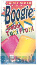 LA ETIQUETA DE FONDO AZUL, VERDE Y BLANCO SOBRE CUYA PARTE SUPERIOR APARECE UN RECTANGULO DE COLOR ROJO DENTRO DEL CUAL FIGURA LA DENOMINACION CHICLE GLOBO. DEBAJO DE ESTE LA FIGURA DE UN EXPLOSION DE COLOR ROJO DEGRADANDOSE AL AMARILLO DENTRO DE LA CUAL APARECE LA DENOMINACION BOOGIE EN LETRAS CARACTERISTICAS