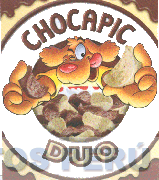 El logotipo conformado por la denominación CHOCAPIC DUO escrita en letras características, y la figura estilizada de un perro con los brazos extendidos; asimismo, se aprecia las figuras de hojuelas de cereal con leche; todo dentro de un semicírculo bordeado con figuras ondulantes; en los colores celeste, rojo, rosado, marrón, beige, blanco, amarillo, anaranjado y negro, conforme al modelo adjunto