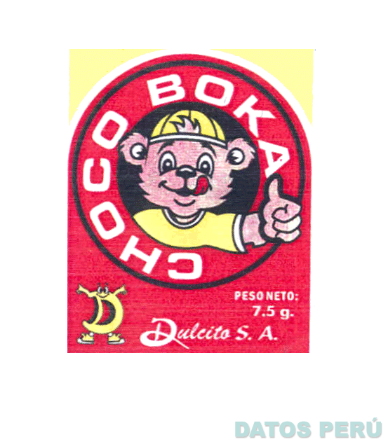 La envoltura conformada por la denominación CHOCO BOKA escrita en letras características alrededor de la figura estilizada de un osito con gorro todo dentro de una circunferencia, en la parte inferior izquierda la representación estilizada de la letra D seguida de la frase DULCITO S.A. escrita en letras características, en los colores amarillo, rojo y blanco, negro y marrón; conforme al modelo adjunto