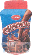 La etiqueta constituida por la denominación E. WONG CHOCOLAC escrita en letras características, donde la denominación E. WONG se encuentra dentro de una figura ovoide; asimismo se aprecia la representación de un vaso, todo dentro de la figura de un frasco; conforme al modelo adjunto