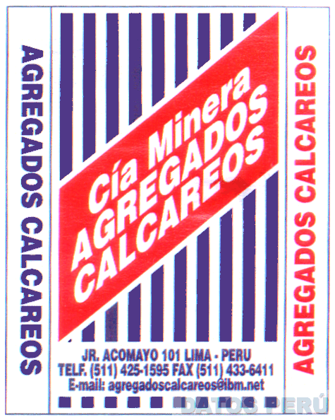 LA DENOMINACION CIA. MINERA AGREGADOS CALCAREOS ESCRITA EN LETRAS CARACTERISTICAS EN EL COLOR BLANCO EN FORMA DIAGONAL Y EN TRES LINEAS, SOBRE UNA FIGURA TRAPEZOIDAL EN EL COLOR ROJO QUE VA SOBREPUESTA A LINEAS PARALELAS Y VERTICALES EN LOS COLORES AZUL Y BLANCO; Y LEYENDAS ALUSIVAS AL PRODUCTO; SEGUN MODELO ADJUNTO,