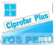 El logotipo conformado por la denominación CIPROFAR PLUS escrita en letras características dentro de un rectángulo con bordes redondeados, en la parte superior se aprecia la denominación LAFAR escrita en letras características formando una cruz, todo en los colores blanco, turquesa y celeste; conforme al modelo adjunto