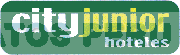 El logotipo conformado por la denominación CITY JUNIOR HOTELES escrita en letras características; todo dentro de una figura geométrica; todo en la combinación de colores blanco, amarillo y verde; conforme al modelo adjunto