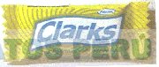 La denominación CLARKS escrita en letras características en color azul dentro de un rectángulo ondeado de fondo blanco y bordes azul con dorado, todo dentro del empaque característico de colores amarillo con líneas doradas; conforme al modelo
