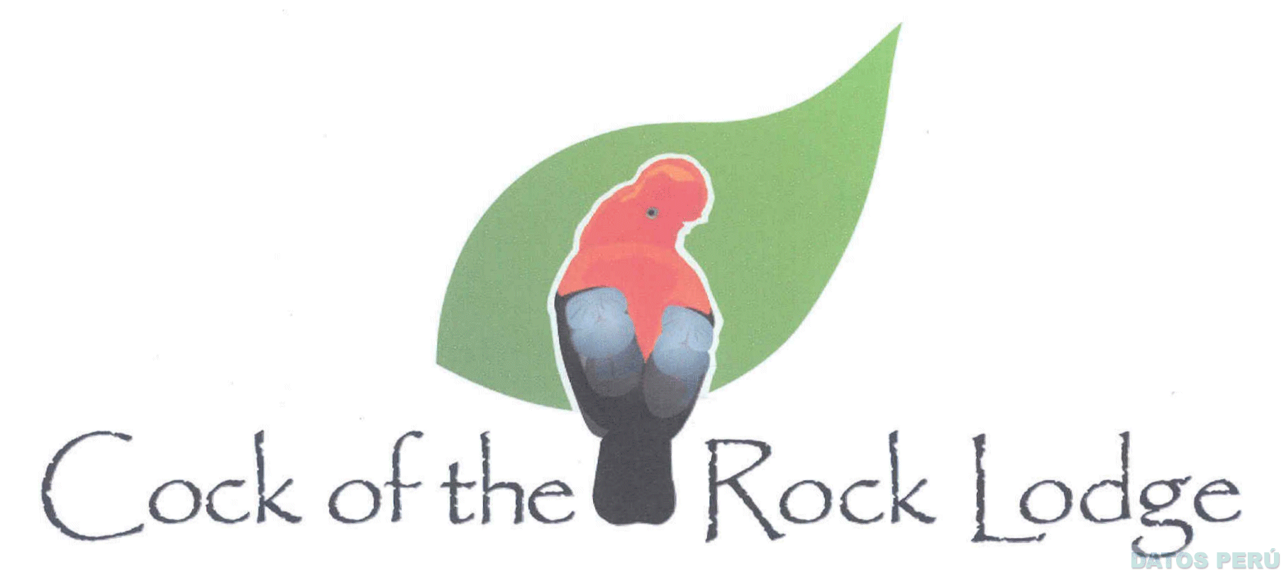 La denominación COCK OF THE ROCK LODGE escrita en letras características y la representación estilizada de un ave sobre una hoja, todo en la combinación de colores verde, rojo, anaranjado, negro y plomo en varias tonalidades; conforme al modelo adjunto