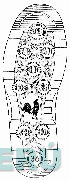 La forma bidimensional de una planta de calzado en cuya suela se aprecian diversas figuras circulares conteniendo la denominación COCKER escrita en letras características, así como figuras estilizadas de saetas; en la parte central se aprecia la figura estilizada de un gallo dentro de una figura irregular; a los costados se aprecian diversas figuras cuadrangulares y; en la parte superior e inferior se aprecian diversas líneas horizontales y una línea curva; conforme al modelo adjunto