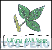 La denominación COCOTAL HOJA VERDE escrita en letras características dentro de una figura rectangular ondeada y en la parte superior la representación estilizada de una hoja con un tallo, en los colores verde en dos tonalidades, negro y blanco; conforme al modelo adjunto.