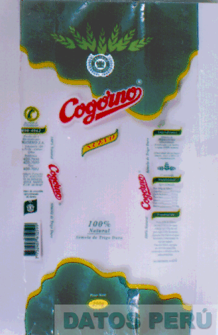 LA ENVOLTURA CONSTITUIDA EN SU PARTE SUPERIOR POR UNA FIGURA AMORFA, EN CUYO INTERIOR ENCONTRAMOS ESPIGAS DE TRIGO Y SOBRE ESTA LA DENOMINACION COGORNO. EN SU PARTE INFERIOR VEMOS OTRA FIGURA AMORFA, EN LOS COLORES VERDE CLARO Y VERDE OSCURO, ROJO Y AMARILLO; SEGUN MODELO ADJUNTO,