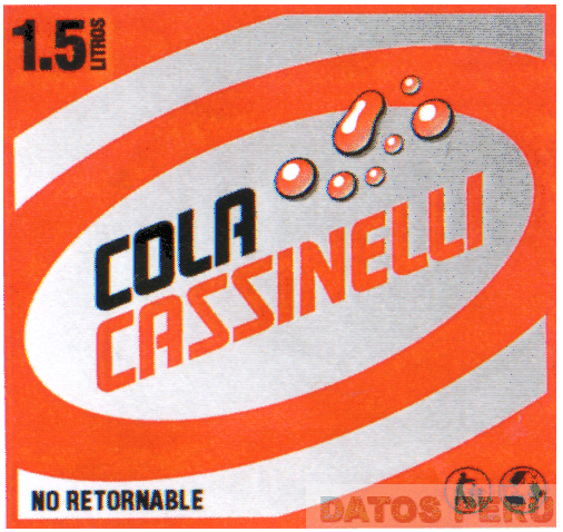 LA ETIQUETA DE FONDO ROJO EN LA QUE DESTACAN LA PALABRA COLA EN COLOR NEGRO Y LA PALABRA CASSINELLI EN COLOR ROJO, 1.5 LITROS, UN CIRCULO OVALADO Y FRANJAS DE COLOR GRIS, LAS PALABRAS NO RETORNABLE Y BURBUJAS, SEGUN MODELO ADJUNTO
