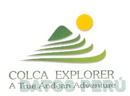 El logotipo conformado por la frase COLCA EXPLORER A TRUE ANDEAN ADVENTURE escrita en letras características con figuras y un círculo que representan a un cerro y un sol; todo en colores verde oscuro, verde claro y amarillo; conforme al modelo adjunto