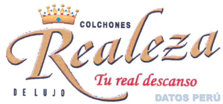 El logotipo conformado por la denominación COLCHONES REALEZA escrita en letras características; sobre la letra R se aprecia una corona; en la parte inferior izquierda se observa las palabras DE LUJO y al lado derecho la frase TU REAL DESCANSO; todo en los colores dorado, rojo, amarillo, celeste y negro; conforme al modelo adjunto
