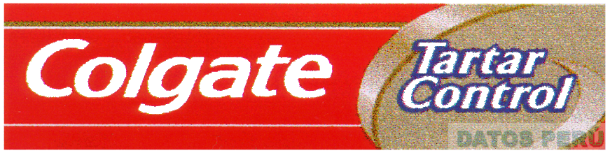 LA DENOMINACION COLGATE TARTAR CONTROL, EN LETRAS CARACTERISTICAS, DENTRO DE UNA ETIQUETA RECTANGULAR CON FONDO ROJO FORMADO POR LINEAS HORIZONTALES Y FIGURAS ELIPTICAS Y ONDULANTES, TODO EN LOS COLORES ROJO, BLANCO, DORADO, AZUL, CONFORME AL FACSIMIL ADJUNTO,