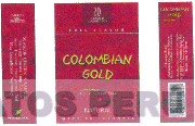 El empaque de color rojo oscuro que contiene la denominación COLOMBIAN GOLD escrita en letras características, y demás frases alusivas al producto, y debajo la representación de una línea ondeada, en los colores verde, amarillo, anaranjado y azul; conforme al modelo adjunto