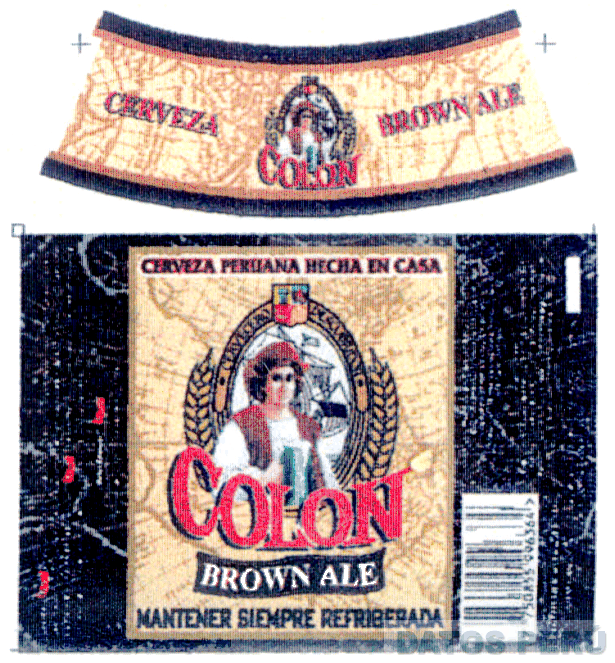 La denominación COLON escrita en letras características dentro de una figura rectangular, en la parte superior se observa una figura ovalada conteniendo la representación estilizada de una persona y una embarcación, a los lados se observan dos espigas estilizadas, en la parte inferior de la denominación se aprecian las palabras BROWN ALE escritas en letras características dentro de una figura rectangular; sobre esto se observa una figura rectangular conteniendo la denominación COLON escrita en letras características, las palabras CERVEZA BROWN ALE escrita en letras características y una figura ovalada conteniendo la representación estilizada de una persona y una embarcación a cuyos lados se observan dos espigas estilizadas y demás frases alusivas al producto, en los colores rojo, dorado, amarillo, crema, verde, blanco y negro; conforme al modelo adjunto