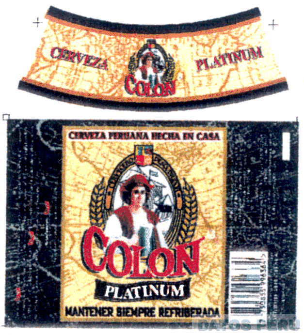 La denominación COLON escrita en letras características dentro de una figura rectangular, en la parte superior se observa una figura ovalada conteniendo la representación estilizada de una persona y una embarcación, a los lados se observan dos espigas estilizadas, en la parte inferior de la denominación se aprecia la palabra PLATINUM escrita en letras características dentro de una figura rectangular; sobre esto se observa una figura rectangular (semi curva) conteniendo la denominación COLON escrita en letras características, las palabras CERVEZA PLATINUM escrita en letras características y una figura ovalada conteniendo la representación estilizada de una persona y una embarcación a cuyos lados se observan dos espigas estilizadas y demás frases alusivas al producto, en los colores rojo, dorado, amarillo, crema, verde, blanco y negro; conforme al modelo adjunto