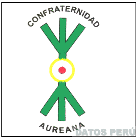 La denominación CONFRATERNIDAD AUREANA escrita en letras características, dos figuras geométricas en cuyo centro se aprecia una figura circular conteniendo un punto, en los colores rojo, verde, blanco, amarillo; conforme al modelo adjunto