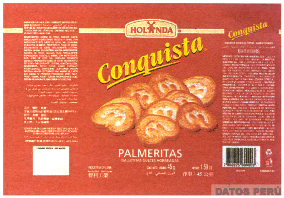 La envoltura rectangular de fondo color rojo conteniendo la denominación CONQUISTA escrita en letras características de color amarillo y borde negro, en la parte central se observan galletas en colores marrón claro y blanco y debajo la frase PALMERITAS GALLETITAS DULCES HORNEADAS en color blanco, en la parte superior la denominación HOLANDA escrita en letras características en color rojo sobre una figura semi-rectangular de color beige y una línea horizontal beige, a ambos lados de la envoltura se observan palabras alusivas al producto en color blanco; conforme al modelo adjunto