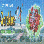 El logotipo conformado por la denominación CONSERVAS GERALDINE en un mar con espumas de olas reventadas y fondo color azul claro estando un niño sobre una tabla, teniendo la mano derecha hacia atrás y la mano izquierda levantada hacia arriba, tiene el cabello lacio de color negro, tiene puesto un short de fondo celeste con pintas de color verde, amarillo y azules, en su pie derecho tiene una soguilla de color negro que esta sujeta a la tabla; la tabla es de color rosado; en la parte superior del lado izquierdo tiene la palabra CONSERVAS con letras de color blanco, en la parte central con letras más grandes la palabra GERALDINE de color amarillo con sombras negras y en la última letra E de dicha palabra se aprecia al pez caballa elevándose hacia la parte superior, se nota claramente sus aletas y la forma del rayado resaltando las pintas blancas; el fondo del ojo del pescado es de color amarillo y en el centro un punto de color verde; debajo de la palabra GERALDINE esta la palabra FILETE DE PESCADO de color verde con sombras de color blanco y más abajo la palabra EN ACEITE VEGETAL de color blanco con bordes negros; en el lado derecho apreciamos la figura de un plato que no se distingue porque está adornado con lechugas y dentro de ella contiene trozos de tomate, zanahoria, arvejas, pimiento y filete de pescado; conforme al modelo adjunto