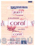 La etiqueta rectangular que contiene la denominación CORAL escrita en letras características y encerrada dentro de un recuadro, y la representación de un pez, una formación coralina y estrellas de mar, todo sobre un fondo jaspeado, en los colores beige, guinda, rojo, anaranjado en diversas tonalidades y rosado; conforme al modelo adjunto