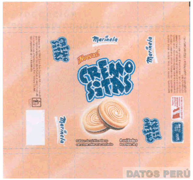 La etiqueta conformada por la denominación CREMOSITAS escrita en letras características en la parte central y a los lados derecho, izquierdo y superior la denominación MARINELA escrita en letras características, en la parte interior la figura estilizada de dos galletas, en la combinación de colores azul, blanco, melón, rojo, amarillo, crema y marrón; conforme al modelo adjunto