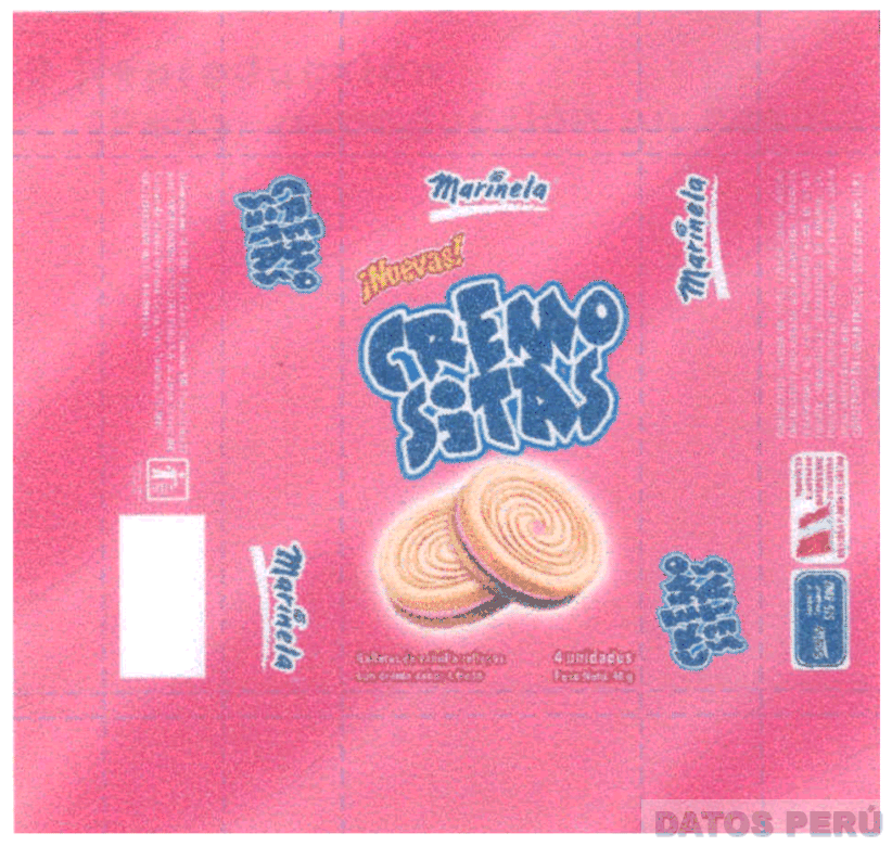 La etiqueta conformada por la denominación CREMOSITAS escrita en letras características en la parte central y a los lados derecho, izquierdo y superior la denominación MARINELA escrita en letras características, en la parte interior la figura estilizada de dos galletas, en la combinación de colores azul, blanco, rojo, rosado, amarillo, crema y marrón; conforme al modelo adjunto