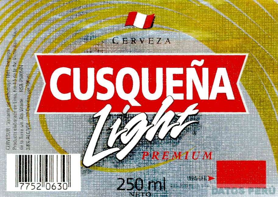 La etiqueta rectangular conteniendo la denominación CUSQUEÑA LIGHT escrita en letras características, donde la palabra CUSQUEÑA se encuentra encerrada dentro de un figura irregular rectangular, en la parte superior se aprecia la bandera del Perú y la denominación CERVEZA y debajo de todo la denominación PREMIUM, todo sobre un fondo que asemeja unas olas y en los colores rojo, blanco, dorado y plateado; conforme al modelo adjunto
