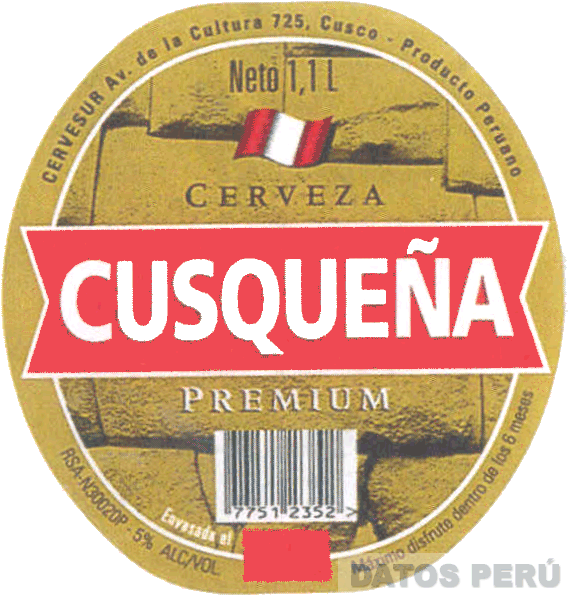 La etiqueta de forma ovalada impresa en color dorado con fondo de una pared de piedra en la parte central la denominación CUSQUEÑA escrita en letras estilizadas, dentro de una figura poligonal irregular, y en la parte superior central una bandera peruana flameando y las palabras CERVEZA y PREMIUM en la combinación de colores dorado, blanco, rojo y negro; conforme al modelo adjunto