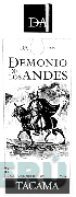 La etiqueta que contiene las letras estilizadas DA y debajo la denominación DEMONIO DE LOS ANDES escrita en letras características y la figura de un conquistador sobre un caballo y debajo la denominación TACAMA escrita en letras características y demás leyendas alusivas al producto, sin reivindicar colores; conforme al modelo adjunto
