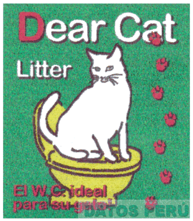 LA DENOMINACION DEAR CAT LITTER ESCRITA EN LETRAS CARACTERISTICAS DONDE LA LETRA D ES DE COLOR ROJO Y LAS DEMAS LETRAS DE COLOR BLANCO Y LA REPRESENTACION DE UN GATO BLANCO SENTADO EN UN INODORO AMARILLO, APRECIANDOSE AL LADO DERECHO Y EN FORMA VERTICAL ONDEADA SIETE FIGURAS IRREGULARES A MANERA DE HUELLAS DE GATO, CONFORME AL MODELO ADJUNTO,