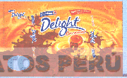 La etiqueta característica en colores anaranjado, amarillo y marrón, simulando la caída del relleno del caramelo, y que contiene en la parte central la denominación DELIGHT escrita en letras características en color azul y blanco y la denominación CARAMEL escrita en letras características en color anaranjado y blanco, los cuales se repiten cuatro veces en toda la etiqueta, debajo aparecen la figura de un caramelo anaranjado derramando el líquido que contiene; en la parte superior izquierda aparece la denominación COLOMBINA escrita en letras características al interior de una figura irregular de fondo azul, el punto de la letra I se encuentra representado por la figura de un rombo, al lado derecho se aprecia la figura estilizada de un rombo de color rojo y en su interior la figura estilizada de una media luna de color blanco, sobre la cual se aprecia la figura estilizada de una mujer sentada en color azul, estos elementos se repiten cuatro veces en toda la etiqueta; en la parte superior derecha aparece una figura característica de color rojo y blanco que contiene la frase MADE WITH REAL BUTTER AND FRESH CREAM escrita en color blanco; en la parte inferior izquierda aparece una figura ovalada; conforme al modelo adjunto